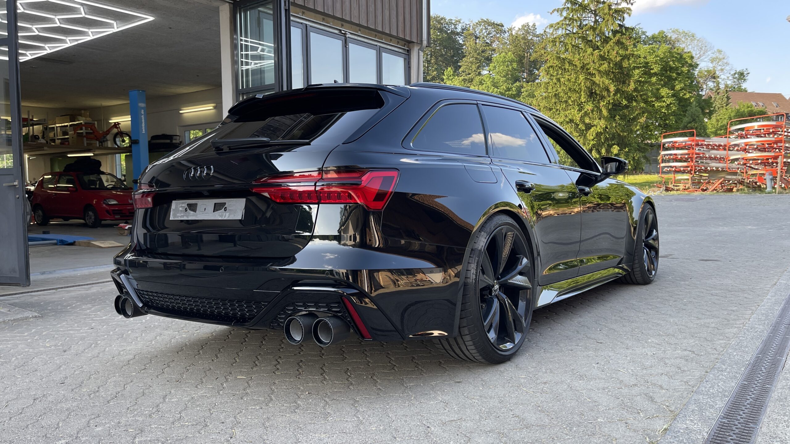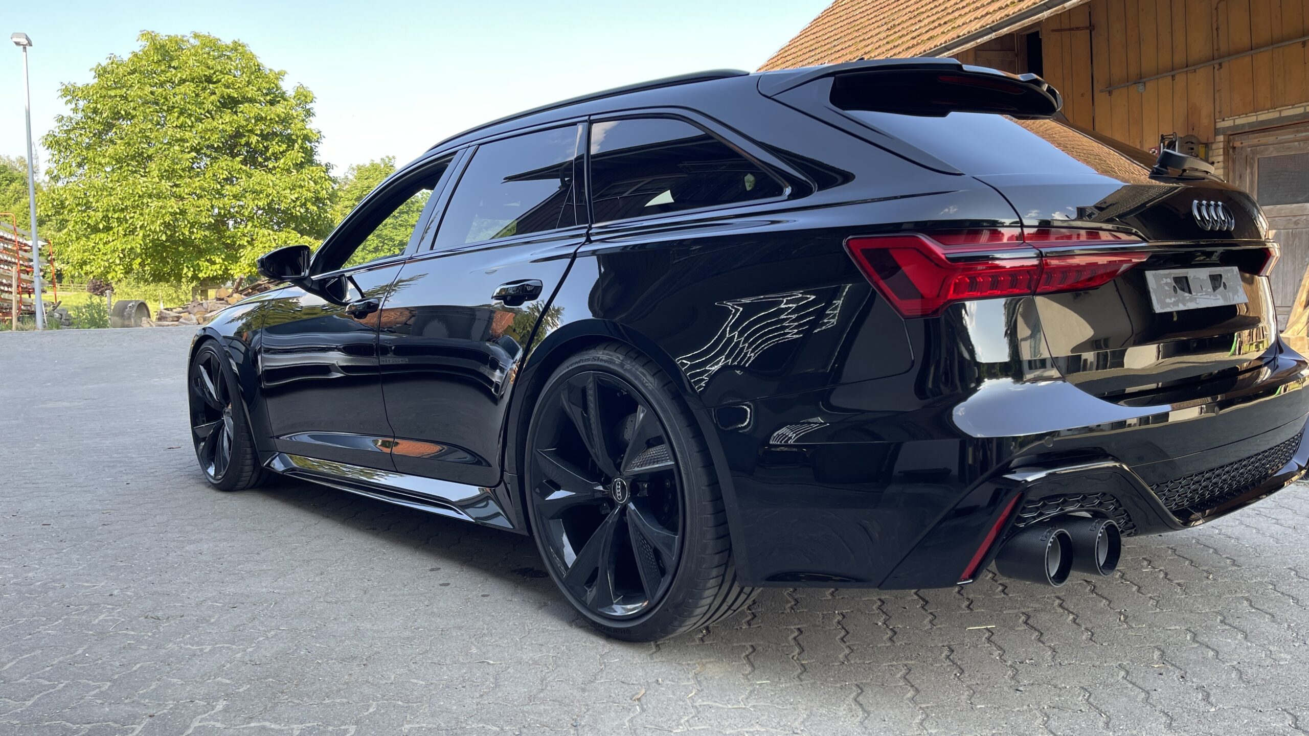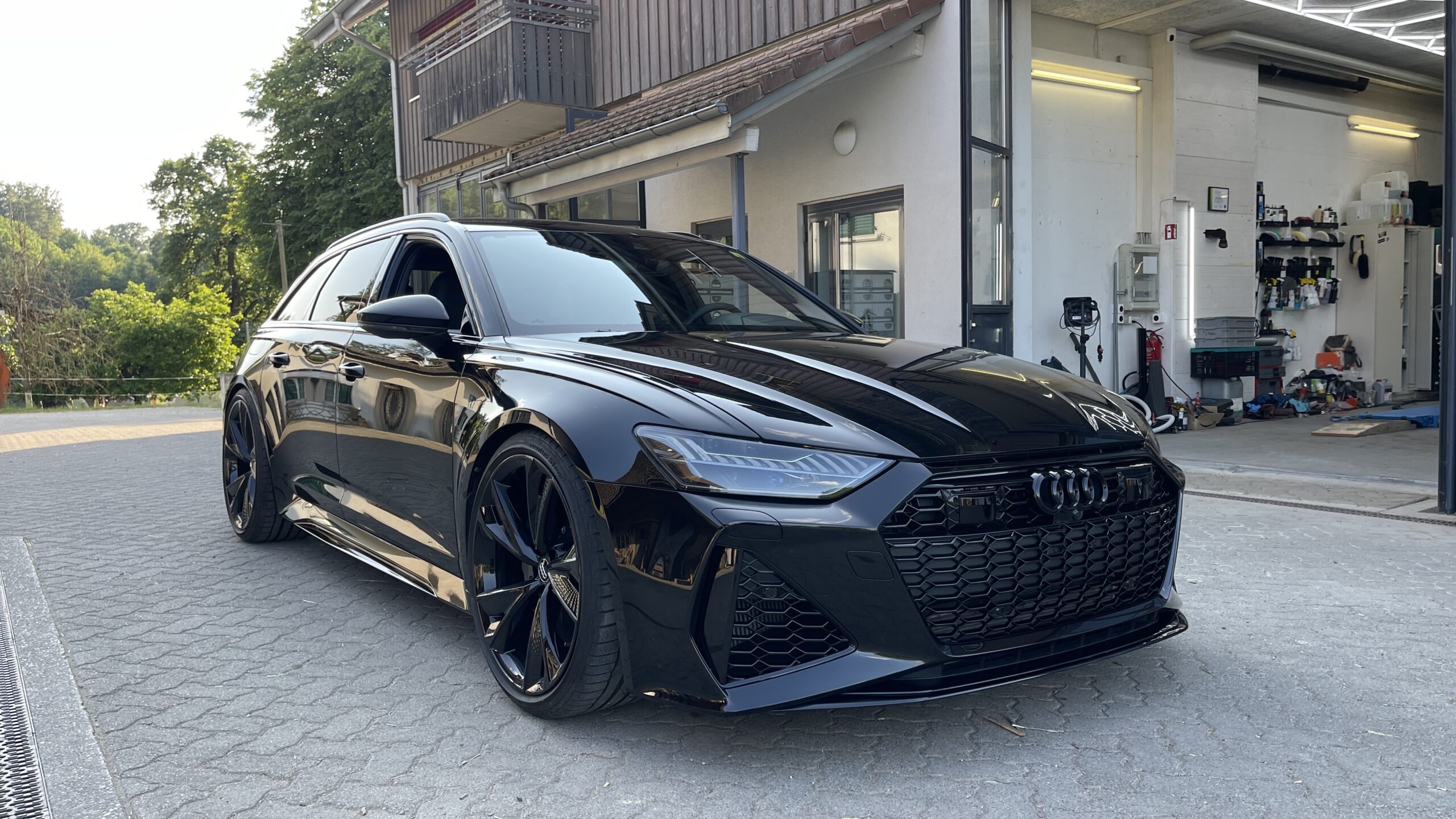 Der Audi RS 6 Avant strahlt nun in voller Pracht – das tiefe Schwarz reflektiert das Licht wie ein Spiegel, und jede Linie des Fahrzeugs wird perfekt zur Geltung gebracht.
