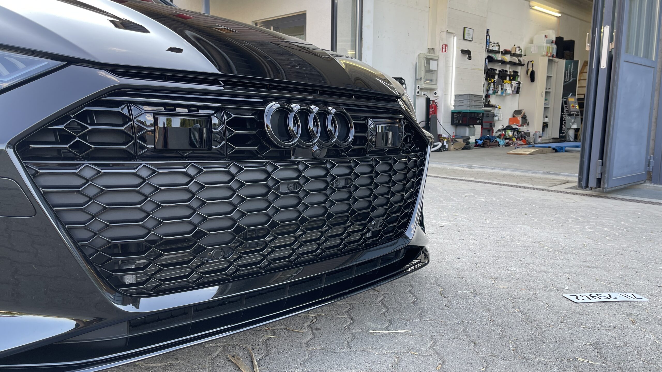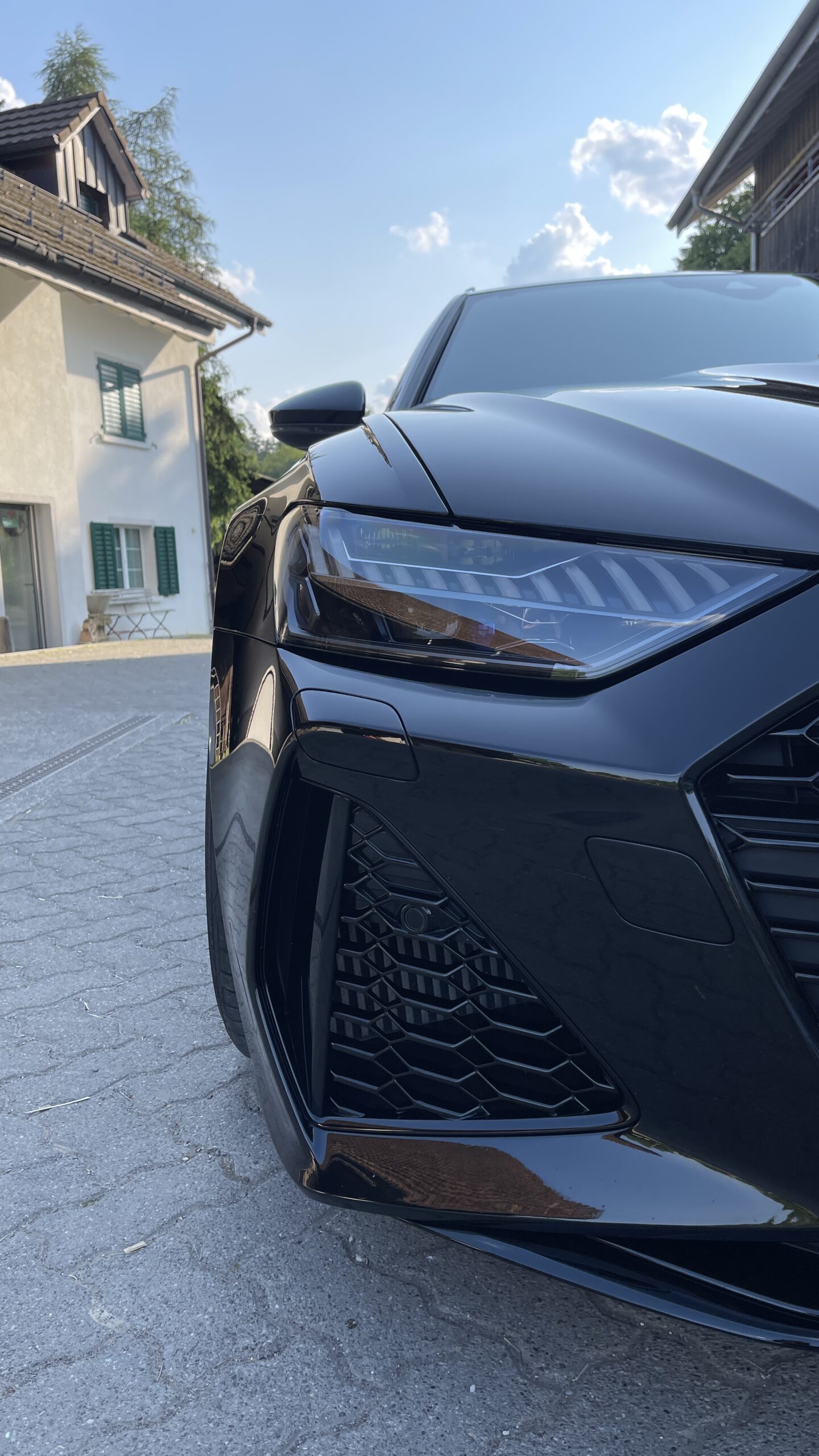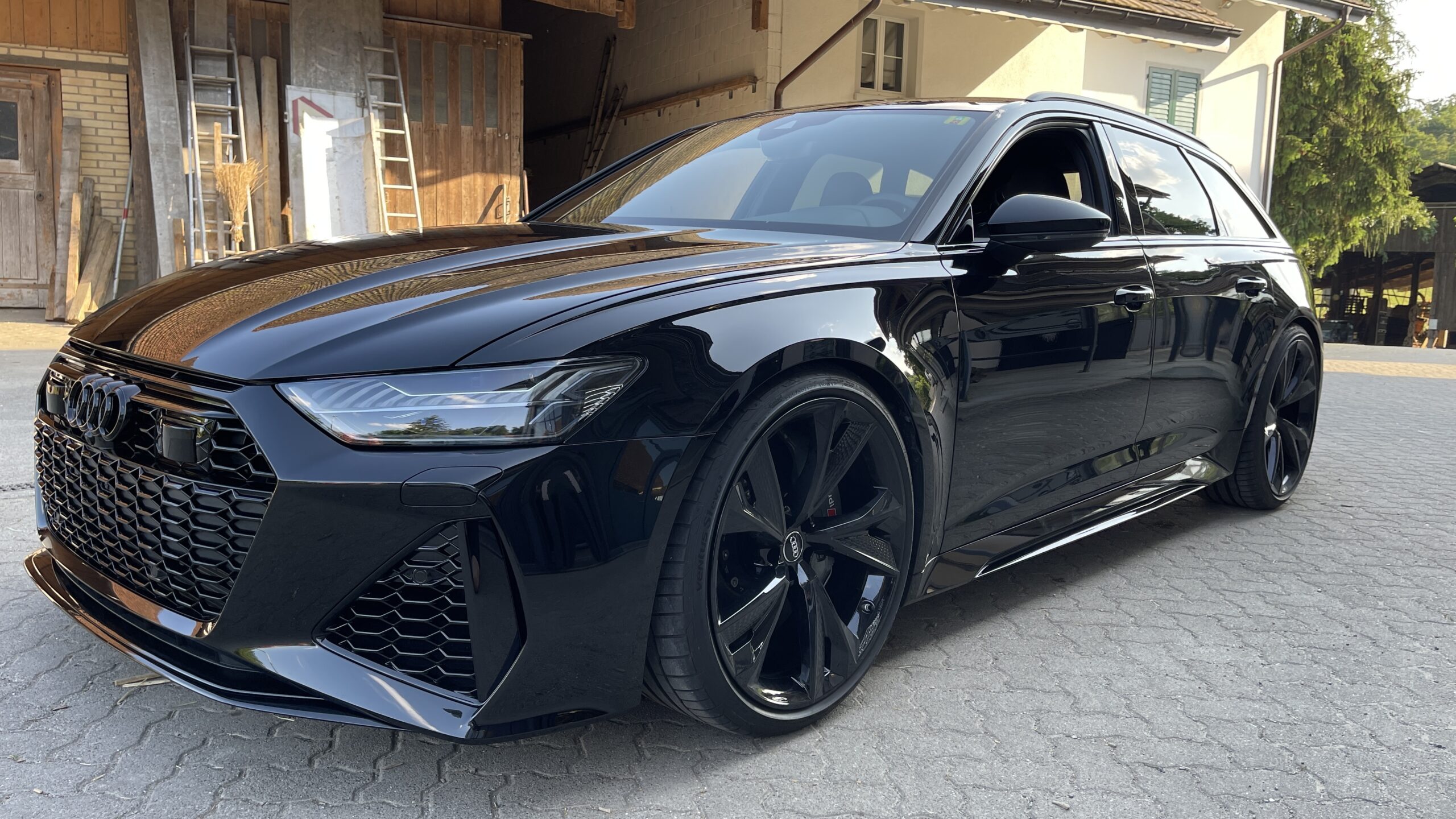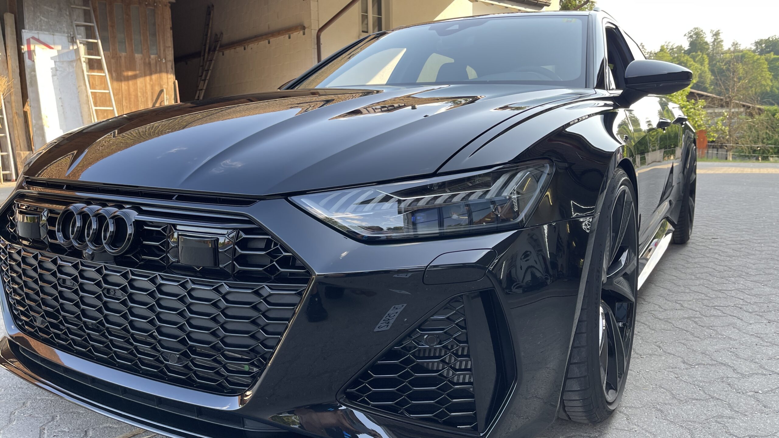 Der Audi RS 6 Avant strahlt nun in voller Pracht – das tiefe Schwarz reflektiert das Licht wie ein Spiegel, und jede Linie des Fahrzeugs wird perfekt zur Geltung gebracht.
